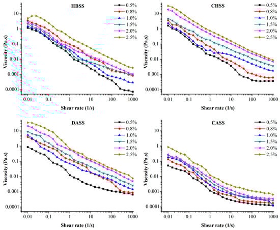 The MLPs solutions at different concentrations (0.5%, 0.8%, 1.0%, 1.5%, 2.0%, and 2.5%) were studied under the selected range of 0.01–1000 s−1 at 20 °C [33,52].