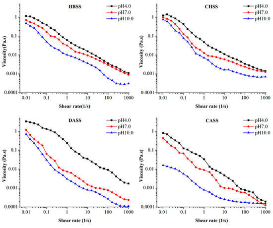 Briefly, 1.0% of MLPs solutions were added to NaOH or HCl to adjust the pH values from 4.0 to 10.0, respectively to measure the apparent viscosity under the selected range of 0.01–1000 s−1 at 20 °C [33,52].