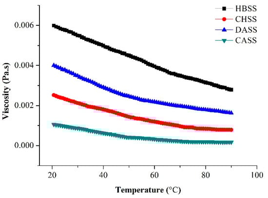 For this, apparent viscosity of MLPs fractions was determined at the same range (1.0%) at a stable shear rate (100 s−1) as shown in Figure 4. The viscosity values of four fractions were lowered with the rising temperature (20 to 90 °C). Four samples solutions showed the change in the apparent viscosity, such as 53.42%, 68.73%, 59.25%, 83.87% for HBSS, CHSS, DASS, and CASS, respectively. The major alteration in the apparent viscosity was observed for CASS; whereas, HBSS displayed the least change of all samples. Moreover, HBSS possessed the stronger viscosity over the temperature range of 20–90 °C. From the above data, we can conclude that the larger change in the viscosity of samples led to the weaker heat stability. These results indicate that the HBSS fraction can preferably be applied in baking processing.