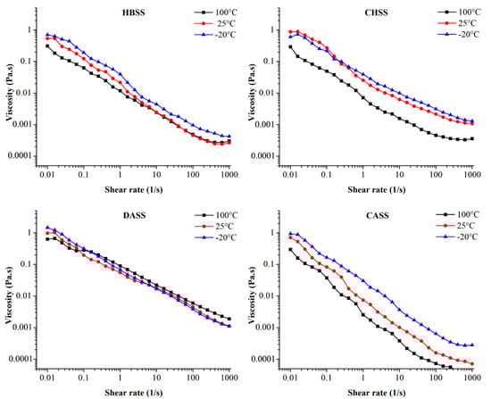As shown in Figure 5, various temperature treatments caused significant change in the apparent viscosity measurements. The apparent viscosity was noticeably changed after heating or freezing treatment and the change in the viscosity values of CHSS and CASS was higher than the remaining fractions. The apparent viscosity of samples solutions was increased after the freezing process (−20 °C) as compared to heating (100 °C). The apparent viscosity value of DASS was the highest among all samples after the freezing treatment, which indicated that DASS can be more suitable as a stabilizer in freeze processing. As previously reported, high temperature could increase the thermal motion of molecules and intermolecular distance, which could further weaken the interactions and recede the apparent viscosity [42]. The change in the apparent viscosity might be due to transitions in the consequent phase of water and the change in composition as described in the previous studies [43].