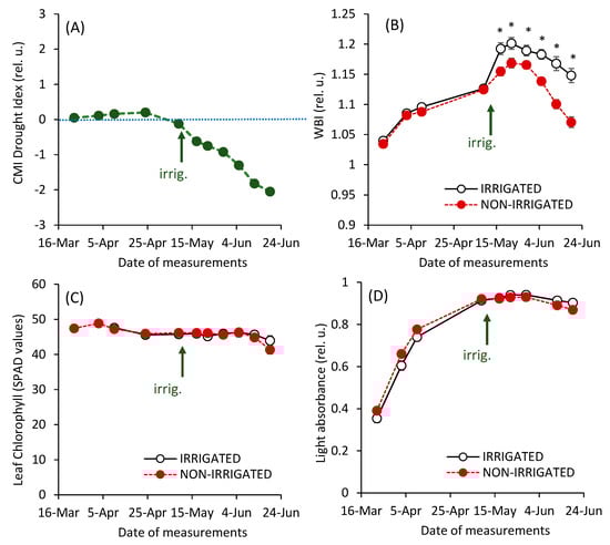 (A) Crop moisture index (CMI) drought index for non-irrigated variant, based on weather and soil observations during the spring vegetation period of wheat; (B–D) The trends of the indicators of the plant and canopy status measured at the leaf and canopy level during the spring vegetation season of wheat: (B) Water Band Index; (C) Leaf chlorophyll SPAD; and (D) light absorbance. The parameters were calculated using the records measured in wheat leaves in two variants of irrigation. The points represent the mean values ± standard error of 25 genotypes, 10 individuals per genotype (n = 250). An asterisk indicates significant differences between non-irrigated and irrigated variants (Tukey HSD post hoc tests, p < 0.05).
