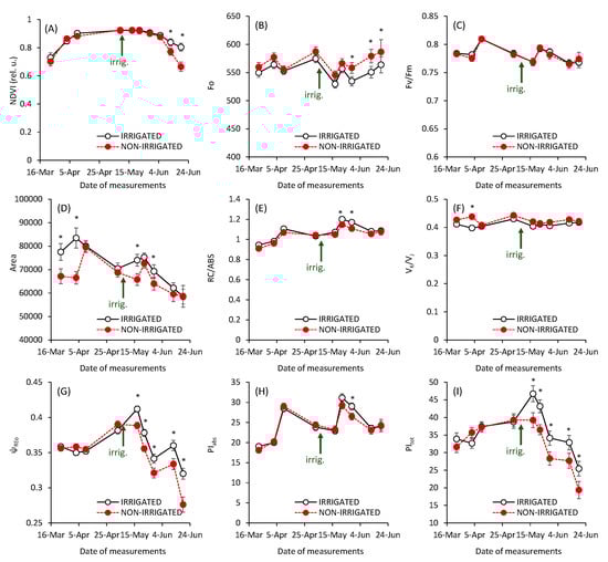 Parameters based on spectral reflectance and chlorophyll fluorescence records in wheat grown in field in two variants differing in water supply: (A) Normalized Difference Vegetation Index (NDVI); (B) Minimum fluorescence from dark-adapted leaf (F0); (C) Maximum quantum yield of primary photochemistry of photosystem II (Fv/Fm); (D) Proportion of QB-non-reducing PSII center (Area); (E) The number of reaction centers per absorbed light unit (RC/ABS); (F) Relative variable fluorescence in K-step (VK/VJ); (G) Probability with which the electron trapped by PSII will reach the secondary quinone electron acceptor QB (ψETo); (H) Performance index on absorption basis (PIABS); and (I) Total performance index (PITOT). Days of the season are characterized on the x-axis; the period of initiation of irrigation is indicated. The points represent the mean values ± standard error of 25 genotypes, 10 individuals per genotype (n = 250). An asterisk indicates significant differences between non-irrigated and irrigated variants (Tukey HSD post hoc test, p < 0.05).