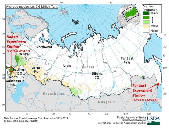 In most soybean-producing countries, the warming of the climate during the recent decades is excessive and represents a risk factor for the yields of soybean crop (Glycine max (L.) Merr.) [1,2,3,4,5]. In some soybean-producing regions, the factor limiting productivity is the lack of precipitation [3,6]. At the same time, the warming in the regions of Russia with temperate climate has increased opportunities for the active development of soybean production.