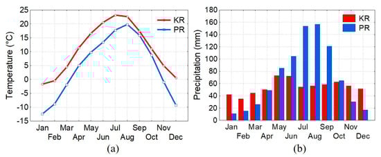 The air temperature in KR is higher than in PR in all months (Figure 2). The transition of temperatures above 10 °C in KR occurs 1.5 months earlier in spring, and a week later in the fall.