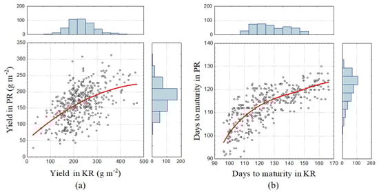 For a set of 424 studied varieties, the yield was significantly higher in KR than in PR (225.3 g m−2 vs. 163.1 g m−2; the significance level of the Student’s t-test for dependent samples was p < 0.001), the time to maturity was longer (125.5 days vs. 112.9 days, p < 0.001), while the 1000 seed weight did not differ significantly (162.0 vs. 155.3 g, p = 0.259). The varieties with a longer time to maturity also had it longer in PR, but the relationship was non-linear (Figure 3).