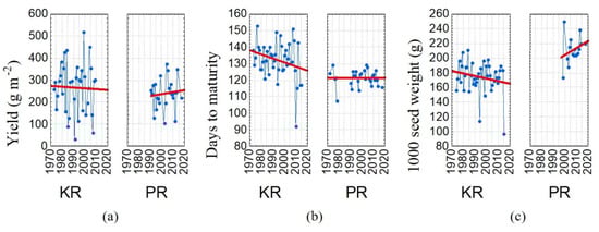 Dynamics of the characteristics of the soybean standard varieties in KR and PR: (a) crop yield; (b) number of days from emergence to maturity; (c) 1000 seed weight. Red line—the linear trend.