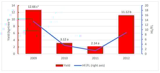 Mean yields of ‘Regina’ sweet cherry trees in 2009–2012 and percentage of harvested fruit to the number of flowers ratio (HF/FL). 1 one-way analyses of variance; data in bars marked with the same letter are not significantly different at α = 0.05 (Duncan’s test).