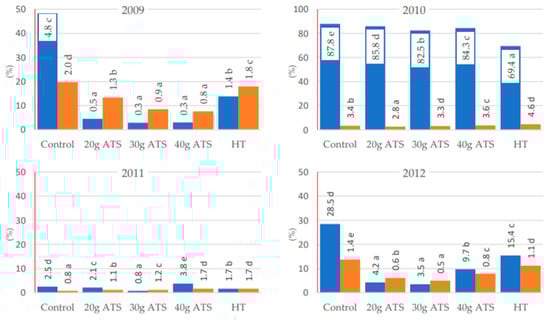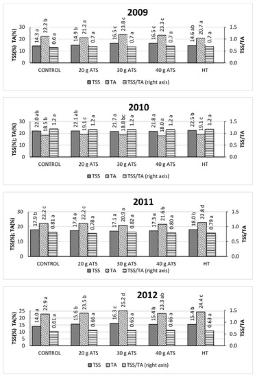 TSS and TA in the fruit depended on the year of experiment. Different courses of weather conditions and the sum of active temperatures determine not only the time of maturation, but also the chemical composition of the fruit [51]. According to earlier studies on cherries, TSS in the fruit could be more influenced by the cultivar and the course of weather conditions than by thinning operations [49] and the year [37]. Some experiments have shown that lower temperatures and heavy rainfalls can decrease the content of soluble solids in cherries. Thinning had an effect on TSS in the full crop years (2009 and 2012), whereas it affected acidity only in 2012. In 2009, the highest extract content was identified in fruit from trees treated with the two highest doses of ATS. In 2012, any thinning procedure increased TSS in the fruit. The mean TSS values for all four years of research showed a positive influence of all thinning methods on this quality trait and the increase ranged from 2.9% to 5.3% (Figure 6). This effect was already observed in previous studies [9,12] and was explained by a lower fruit/leaf area ratio and reduced competition for assimilates between fruit. Similar conclusions were proposed by [6], who stated that fruit yield was negatively correlated with quality parameters.
