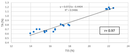Correlation between total soluble solids (TSS) and titratable acidity (TA) of ‘Regina’ sweet cherry fruit in 2009–2012 regardless of treatment.