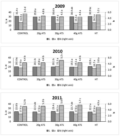 Thinning of buds was found to reduce the value of the a* coordinate [56], but in this experiment, such an effect was observed only in 2010 in fruit from trees hand thinned or sprayed with ATS at a dose of 30 g (Figure 9).