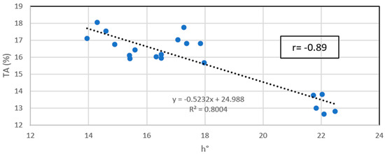 The hue value (h°) was not influenced by thinning in any of the analysed years (Table 5). The correlation coefficient between h° and TSS was negative (−0.89) regardless of year and treatment (Figure 10).