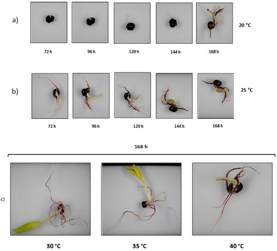 Pictures of germination of Andean purple corn. (a) Germination of purple corn seeds at 20 °C for 72, 96, 120, 144, and 168 h; (b) germination of purple corn seeds at 25 °C for 72, 96, 120, 144, and 168 h; (c) germination of purple corn seeds at 30 °C, 35 °C, and 40 °C for 168 h.