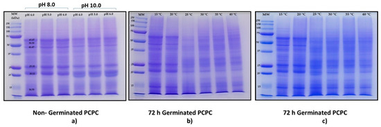 Analysis of protein profile of purple corn protein phenolic concentrates (PCPC) by sodium dodecyl sulfate-polyacrylamide gel electrophoresis (SDS-PAGE). (a) Non-germinated PCPC obtained at (pH 8.0 and pH 10 alkaline extraction) and different pHs of precipitation; (b) germinated PCPC at (pH 8.0 alkaline and pH 4.0 of precipitation) for 72 h; (c) germinated PCPC at (pH 10 and pH 4.0 of precipitation) for 72 h.