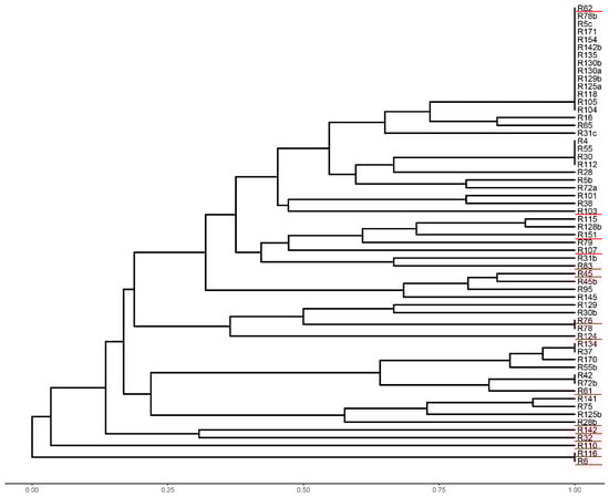 2O—7.9 µL. PCR reaction was carried out according to the following protocol: 1 cycle: 5 min/95 °C; 35 cycles: 30 sec/94 °C, 1 min/52 °C, 8 min/65 °C, 1 cycle: 4 min/65 °C. The PCR product was applied on 1% agarose gel and electrophoresis was carried out for 3 h at 100 V. The GeneRulerTM DNA Ladder Mix was used as a standard. The obtained images were analysed using the bioinformatics platform, Bionumerics (GelCompar II, Saint-Martens-Latem, Kortrijk, Belgium). A phylogenetic tree was prepared using the UPGMA (Bray—Curtis) method, using Past3 v3.25 (Øyvind Hammer, Natural History Museum, University of Oslo) and RStudio packages (Northern Ave, Boston, MA, USA).