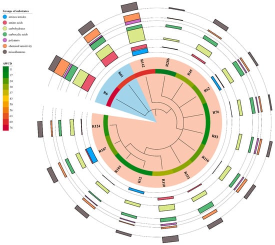 36]. In our research, the opposite results were obtained. The R6 strain, which used the highest number of substrates in the BIOLOG analysis and showed growth on the highest number of substrates in phenotypic tests, did not show a statistically significant effect on plants in the greenhouse test. The results obtained in this group were comparable with the negative control and statistically significantly lower than the results obtained in other experimental groups. At the same time, the best results in the biotest carried out on red clover were found in the group where R116 strain was used, which showed average growth in GENIII plates (44/94 substrates). On the basis of all the analyses carried out, at least five strains with a high metabolic potential were found. However, further research is needed to select the strains that could potentially be of application significance. Positive results obtained from such studies may become the basis for obtaining bacterial strains that can be successfully used in practice.