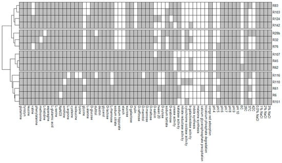 There were 64 different phenotypic tests performed: utilization of 21 carbon and 18 nitrogen sources, 10 enzymatic tests, growth under 15 different conditions (pH, temperature, NaCl). Each strain in 79CA liquid medium (2 mL, OD550 = 0.8) was centrifuged (5488× g for 10 min) and the pellet was suspended in 1 mL of sterile NaCl (0.95%). All samples were in three repetitions. Sterile NaCl (0.95%) was the negative control for all analyses. The results were analysed using Past3 v3.25 (Øyvind Hammer, Natural History Museum, University of Oslo) and RStudio packages (Northern Ave, Boston, MA, USA).