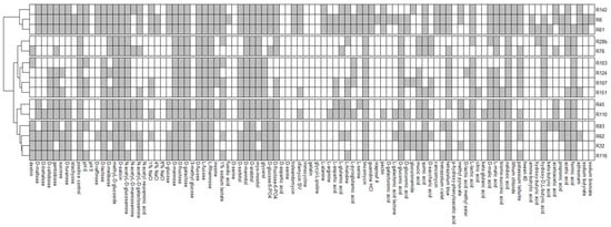 The growth of all analysed strains was observed on 13 media containing methyl-d-glucoside, D-salicin, D-mannose, D-fructose, D-galactose, D-fucose, L-fucose, L-rhamnose, D-mannitol, D-arabitol, lincomycin, lactic acid and nalidixic acid. None of the analysed isolates showed the ability to grow at pH = 5 and on media containing N-acetyl neuraminic acid, 8% NaCl, D-serine, D-aspartic acid, minocycline, gelatin, glycyl-l-proline, p-hydroxy-phenylacetic acid and Tween 40. The R6 strain grew on the highest number of media (71), while growth on the lowest number of media (28) was observed in the case of the R103 strain. Most of the analysed carbon sources (52 out of 71) were used by the R6 and R151 strains, and the least (22 out of 71) by the R103 strain. The R6 strain was the only one which grew on media containing fusidic acid, niaproof 4 and sodium bromate (