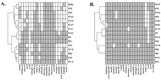 Comparison of two phenotyping tests used in this study was possible due to the presence of the same 20 growth substrates/selective conditions in both methods. For D-galactose and D-mannose, growth of the same number of strains was observed in both analyses. Growth of a higher number of strains in phenotypic tests compared to BIOLOG analysis was observed in the case of media containing dextrin, D-glucose, D-lactose, D-maltose, D-raffinose, L-serine, glycerol, L-alanine, L-arginine, L-glutamic acid, L-histidine and sucrose. Growth of a higher number of strains in BIOLOG analysis compared to phenotypic tests was observed in the case of media containing D-mannitol, D-salicin and L-rhamnose. Phenotypic tests showed growth of all analysed strains on media containing 1% NaCl, whereas BIOLOG analysis showed growth of seven strains. Similarly, the higher number of growing strains in phenotypic tests compared to BIOLOG analysis was observed in the case of media with a pH = 5 (7 and 0, respectively) and pH = 6 (15 and 10, respectively) (