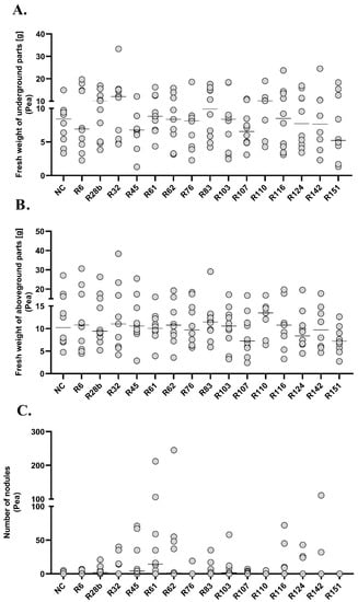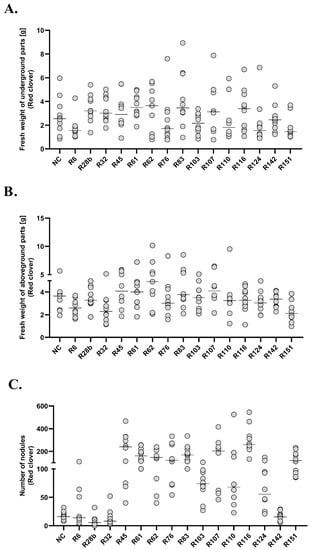 59]. Positive correlations between the fresh weight of underground and aboveground parts and the number of root nodules, in which rhizobia fix nitrogen, may indicate the potential importance of the tested strains as natural bioproduct for red clover [