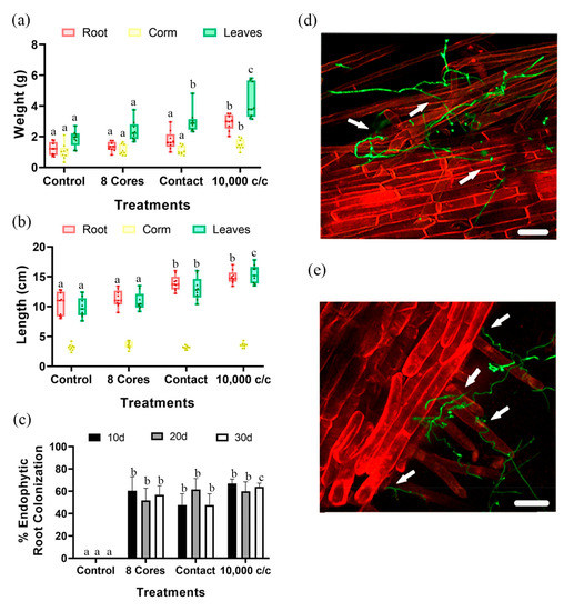 Effect of P. chlamydosporia 123 on banana plantlets. Treatments: eight cores from the edge of 21-day-old P. chlamydosporia (Pc) colony; contact of banana plantlet in Magenta Box with Pc for 5 days; 10,000 c/c spore suspension of Pc; control, uninoculated plantlets. (a) Maximum root, corm, and leaf weight. (b) Fresh root, corm, and leaf length. (c) Endophytic root colonization by Pc123. In the parameters analyzed individually, treatments with different letters indicate significant differences (p-value < α = 0.05), treatments without letters indicate there are no significant differences. (d) Root hairs colonization; (e) rhizoplane colonization of Musa acuminata by Pc123 GFP modified strain. Arrows: indicate possible hyphal penetration points in the root. White bar = 75 μm.