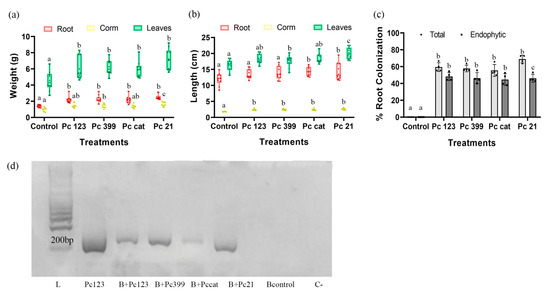 Effect of P. chlamydosporia diversity on the growth of 30-day-old plantlets. Treatments: inoculation of 5 × 104 conidia and chlamydospores suspension of each Pc strains (Pc123, Pc399, Pccat, and Pc21). (a) Root, corm, and leaf corm weight. (b) Fresh root, corm, and leaf length. (c) Total and endophytic root colonization. Growth indicators analyzed individually, the treatments with different letters show significant differences (p-value < α = 0.05), treatments without letters indicate there are no significant differences. (d) Molecular detection of Pc strains colonizing M. acuminata roots, using the vpc1 gene. Abbreviations: L, ladder; B+Pc123, B+Pc399, B+Pc cat, B+Pc21, DNA extracted from 30 dpi roots of banana plant with different strains of Pc; Bcontrol, DNA extracted from 30-day-old plant (M. acuminata) roots without Pc; C-, negative control without DNA.