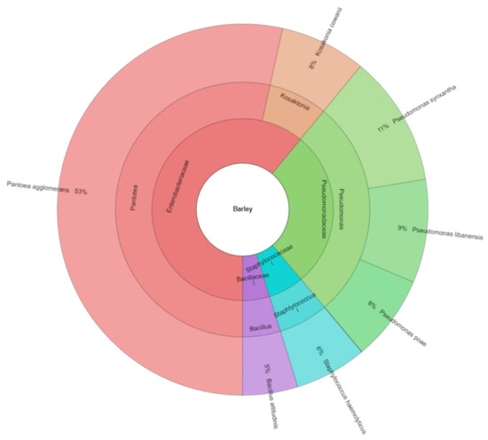 The number of bacteria in barley during storage was higher and the following bacteria were isolated: Bacillus altitudinis, Kosakonia cowanii, Pseudomonas libanensis, Pseudomonas poae, Pseudomonas synxantha, and Staphylococcus haemolyticus. Strains of Pantoea agglomerans formed a dominant part of bacterial isolates from barley. A total of 333 isolates from barley were identified (Figure 1). All isolates were from five genera and four families.