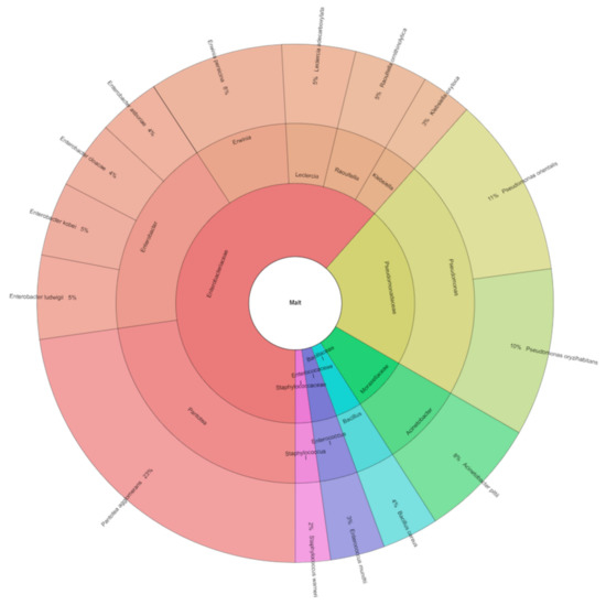 The following bacteria were isolated from malts: Acinetobacter pittii, Bacillus cereus, Enterobacter asburiae, E. cloacae, E. kobei, E. ludwigii, Enterococcus mundtii, Erwinia persicina, Klebsiella oxytoca, Leclercia adecarboxylata, Pantoea agglomerans, Pseudomonas orientalis, Ps. oryzihabitans, Raoultella ornithinolytica, and Staphylococcus warneri. A total of 822 isolates from malt were identified (Figure 2). These bacteria species were from 11 genera and six families. Van Nierop et al. [22] described that the increase in bacterial counts was dominated by Pseudomonas, with a substantial increase in the lactic acid bacteria. In barley, we isolated three species of genera Pseudomonas: Pseudomonas libanensis, Pseudomonas poae, Pseudomonas synxantha, and in malt, two Pseudomonas oryzihabitans and Pseudomonas orientalis.