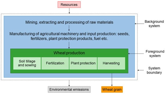 LCA methodology was used to assess the potential impact of the production of winter wheat on the environment. According to the ISO 14,040 and 14,044 standards [,], LCA consists of the following four phases: (1) goal and scope, which involve the definition of the goal of the study, functional unit, system boundaries, assumptions and limitations; (2) inventory analysis in order to collect the required input and output data for the system; (3) impact assessment, including mandatory steps: selection of the impact categories, category indicators and characterisation models, assignment of inventory results to the impact category (classification), evaluation of impact category indicators (characterisation), and optional steps such as normalisation, grouping, weighting; (4) interpretation of the results for drawing conclusions.