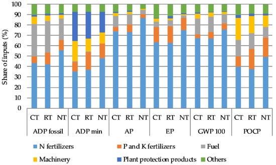 Synthetic N fertilizers had the greatest impact on the formation of potential environmental impacts of wheat production among all inputs, independent of analysed soil tillage system (Figure 3). The AP, EP, and GWP 100 indicators were especially shaped by N fertilizers. For ADP fossil, GWP 100, and AP, the important contributor was also fuel. In the case of the EP indicator, the second biggest contributors after N fertilizers were P and K fertilizers. In turn, for POCP, besides mineral fertilizers, machinery and fuel also had a great impact.