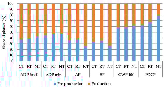 Contribution of the life cycle phases to the environmental impacts of winter wheat production in conventional tillage (CT), reduced tillage (RT), and no-tillage (NT). Abbreviations as in Figure 3.
