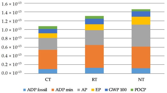 The aggregated environmental index for wheat production was higher in NT (1.47 × 10−13 and RT (1.31 × 10−13) in comparison with CT (1.06 × 10−13) (Figure 5). The environmental index was primarily influenced by ADP min and AP.
