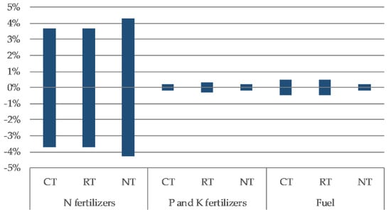 The application of N fertilizers ranked as the most influential factor for the AP of wheat production (Figure 7). An increase in N application rate by 5% led to a change of this indicator by 4.3% for NT and by 3.7% for both CT and RT. The second important factor for AP was the fuel, followed by phosphorus (P) and potassium (K) fertilizers. When fuel consumption varied by 5%, the value of the AP of wheat for both CT and RT changed by 0.5%, while it changed by 0.2% for NT. The AP indicator for wheat in RT was more sensitive to P and K fertilizer application rates compared to wheat in CT and NT.