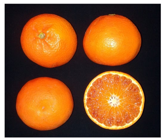 - Caruso, M.; Ferlito, F.; Licciardello, C.; Allegra, M.; Strano, M.C.; Di Silvestro, S.; Russo, M.P.; Paolo, D.P.; Caruso, P.; Las Casas, G.; et al. Pomological Diversity of the Italian Blood Orange Germplasm. Sci. Hortic. 2016, 213, 331–339. [Google Scholar] [CrossRef]