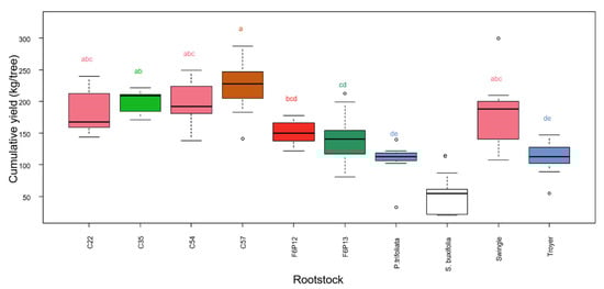 Cumulative yield of Mandared grafted onto 10 rootstocks, calculated from 2015 to 2019. Different letters indicate significantly different means according to Tukey’s test at p < 0.05. Different colors of the boxes indicate different significance groups.
