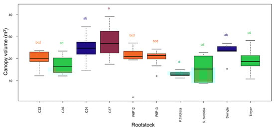 Canopy volume of Mandared grafted onto 10 rootstocks, recorded in spring 2018. Different letters indicate significantly different means according to Tukey’s test at p < 0.05. Different colors of the boxes indicate different significance groups.