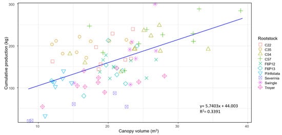 Scatterplot with regression line showing the relationships between canopy volume and cumulative production of the single replicate trees.