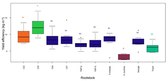 Yield efficiency of Mandared grafted onto 10 rootstocks. Different letters indicate significantly different means according to Tukey’s test at p < 0.05. Different colors of the boxes indicate different significance groups.