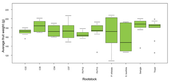The differences in fruit weights among rootstocks were not statistically significant (Figure 6). The average fruit weight was highest for trees on C35 and Swingle (183.6 and 183.9 g, respectively).