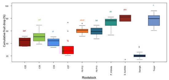 Percentage of fruit drop in Mandared grafted onto 10 rootstocks, recorded between 2016 and 2019. Different letters indicate significantly different means according to Tukey’s test at p < 0.05. Different colors of the boxes indicate different significance groups.