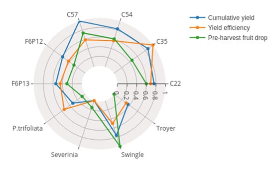 Radar chart showing the yield performance of the 10 rootstocks in combination with Mandared. Data were rescaled independently, normalizing the best performance to 1 and the worst performance to 0 for each parameter.