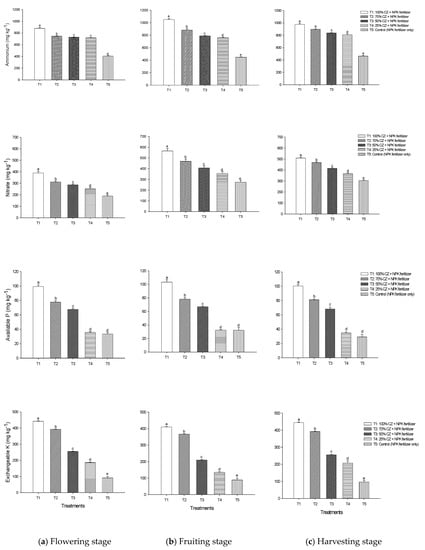 Exchangeable ammonium, available nitrate, available phosphorus, and exchangeable potassium in a peat soil treated with different amounts of CZ and NPK fertilizer throughout papaya plant growth stages: (a) flowering stage; (b) fruiting stage; and (c) harvesting stage. Error bar represents standard error of the mean. Means with different letters indicate significant difference between treatments by Tukey’s test at p ≤ 0.05. CZ: clinoptilolite zeolite; T1: 100% CZ + NPK fertilizer; T2: 70% CZ + NPK fertilizer; T3: 50% CZ + NPK fertilizer; T4: 25% CZ + NPK fertilizer; T5: Control (NPK fertilizer only).