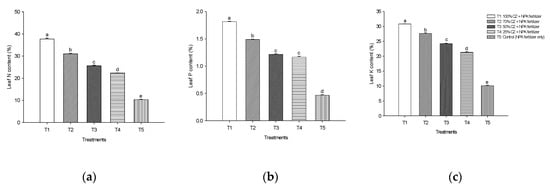 Leaf nitrogen (a); phosphorus (b); and potassium (c) contents during flowering of papaya cv. Sekaki cultivation on a tropical peat soil treated with different amounts of CZ and NPK fertilizer. Error bar represents standard error of the mean. Means with different letters indicate significant difference between treatments by Tukey’s test at p ≤ 0.05. CZ: clinoptilolite zeolite; T1: 100% CZ + NPK fertilizer; T2: 70% CZ + NPK fertilizer; T3: 50% CZ + NPK fertilizer; T4: 25% CZ + NPK fertilizer; T5: Control (NPK fertilizer only).