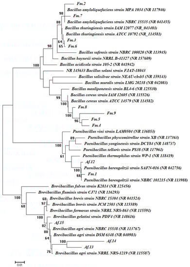 Thirteen endophytic bacterial strains were isolated from the leaves of the two medicinal plants (Table 2). Nine strains were isolated from F. mollis plants and identified as Bacillus spp. (eight strains), and Paenibacillus sp. (one strain), while four bacterial strains were isolated from A. fragrantissima plants and identified as Paenibacillus sp. (one strain) and Brevibacillus sp. (three strains). The 16S rRNA gene sequences of strains Fm.2 to Fm.9 showed 96–99% sequence similarity with the sequences of Bacillus amyloliquefaciens, Bacillus thuringiensis, and Bacillus cereus (Figure 2 and Table 2). The 16S rRNA gene sequences of strains Fm.1 and Af.12 showed 99% of sequence similarity with Paenibacillus barengoltzii. Isolates Af.13 to Af.15 showed between 93 and 99% of 16S rRNA sequence similarity with Brevibacillus agri.