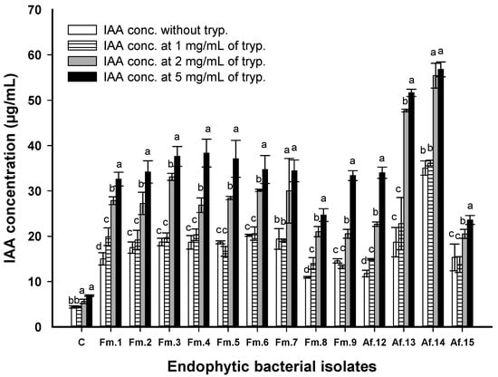 IAA production by the most potent bacterial strains in the presence of 5 mg mL−1 tryptophan and over 14 days. C, controls without any bacterial inoculation. Identity of the bacterial isolates is available in Table 2. At each time point, bars with the same letter did not differ significantly at a significant level of (p ≤ 0.05) by Tukey’s test, (n = 3).