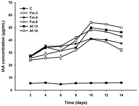 All endophytes identified as Brevibacillus sp. produced the highest amount of ammonia compared to Bacillus spp. strains (Table 5). Moreover, nine endophytes (Fm.2 to Fm.9 and Af.12) displayed significant ability to solubilize inorganic phosphate with clear zone on the Pikovskaya medium ranging from 7.6 ± 0.3 to 9.6 ± 0.3 mm. Results showed that all the isolated strains were IAA producers, with or without tryptophan (Figure 3). However, increasing tryptophan concentration from 1 to 5 mg·mL−1 resulted in increased bacterial ability to produce IAA from 10 to 60 µg·mL−1. Strains of Brevibacillus spp. Af.14, Af.13, Bacillus sp. Fm.6, Bacillus sp. Fm.4, and Bacillus sp. Fm.3 produced the highest amount of IAA, and were selected for further analysis to measure the production of IAA at 2 day intervals in a time course over 14 days. The results indicated that the maximum IAA production with tryptophan was 5 mg mL−1 after 10 days. The results revealed that Brevibacillus sp. Af.14 produced the highest amount of IAA 59.7 µg·mL−1 (p ≤ 0.05; Figure 4).