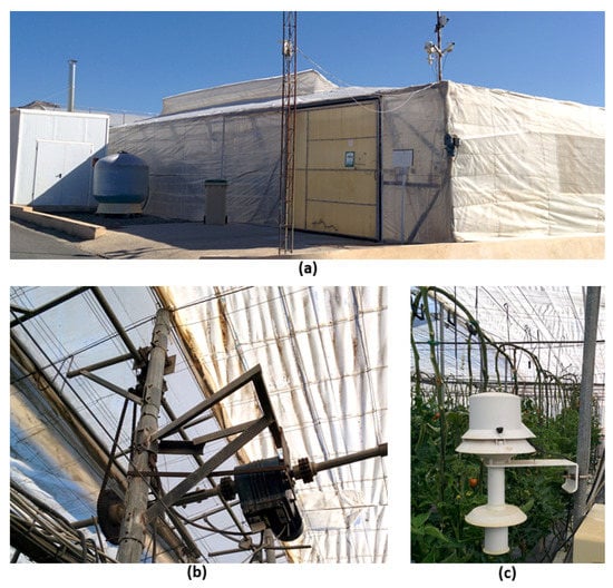 Experimental greenhouse: (a) Exterior view in which roof and side vents can be observed. (b) Motor for the roof vents. (c) Inside air temperature and humidity sensor protected with a solar radiation shield.