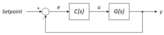 where u is the control signal and e is the control error. The main parameters of a PID controller are the proportional gain, , the integral time, , and the derivative time, . The values for these parameters can be calculated based on different tuning methods depending on the desired control response and the process dynamics [25]. A common formulation for a PID controller as a transfer function in Laplace domain is presented in Equation (6) and a basic feedback control scheme based on a PID controller is shown in Figure 3.