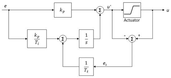 In this work, a PI (Proportional-Integral) controller was selected and the derivative term was omitted mainly because of the noisy signals in the real facilities. An additional modification was made to the basic structure of a PI controller in order to take into account the saturation of the ventilation motors. An anti-windup mechanism based on the back-calculation technique was incorporated to the PI controller to prevent the undesirable “windup” effect of the integral term [25]. When the actuator is saturated, the anti-windup mechanism shown in Figure 4 is designed to reset the integrator value to zero by adding the signal multiplied by the tacking constant . The parameter is an adjustable term to regulate how rapidly the integrator is reset.