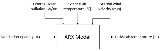The developed ARX model intended as a MISO model is shown in Figure 6. For the system identification procedure, no distinction was made among the model inputs with the purpose of obtaining a simple prediction model. However, the outside weather variables should be considered as measurable disturbances. The three main disturbances affecting the inside air temperature were selected based on previous studies [1]: external solar radiation, external air temperature and external wind velocity.