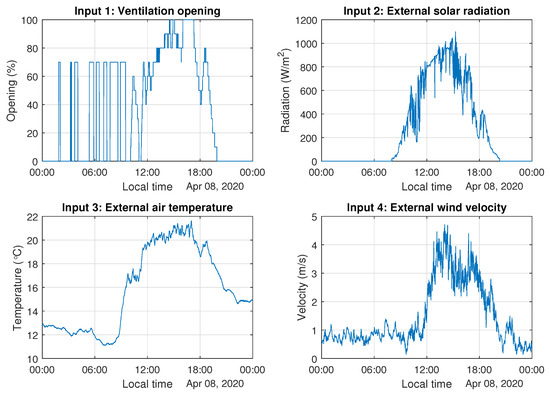 The ARX model was obtained with the system identification procedure explained in Section 2.2. A series of different ventilation tests were performed in the experimental greenhouse during spring 2020 in order to record a sufficient dataset for a proper model identification. In each test, diverse operational conditions were registered focusing on different ventilation opening profiles so that the data could represent the variety of the real greenhouse dynamics. Figure 7 shows an example for the inputs of the ARX model identification. The ventilation opening graphics reveals two different behaviours. During the night, the vents are usually closed and only some periodical openings are required if an active control for inside air humidity is being performed (depending on the crop necessities). During daytime, the ventilation opening varies depending mainly on the imposed limits for the inside air temperature control. Due to the weather conditions of the south-eastern of Spain and the dimensions of the experimental greenhouse, the vents are normally fully opened when the maximum level for external solar radiation occurs. The selected data for identification present a typical range of variation for climatic variables during the spring period at the location of the greenhouse.
